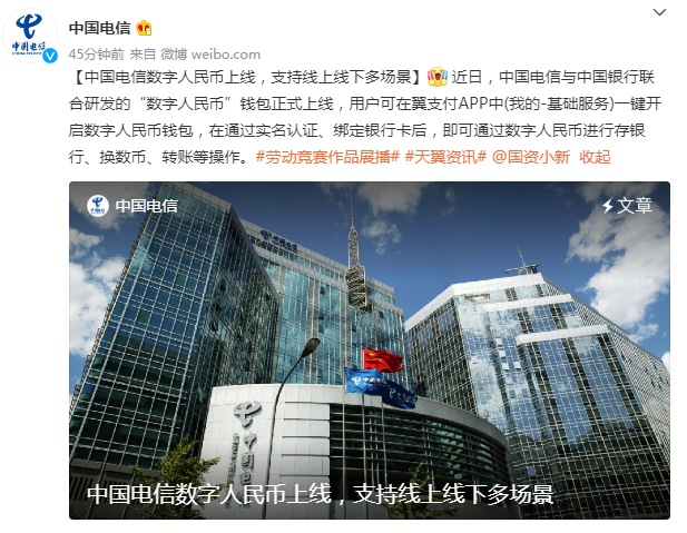中国电信作为中国人民银行数字人民币首批参研单位,积极参与数字人民币业务研发和试点。